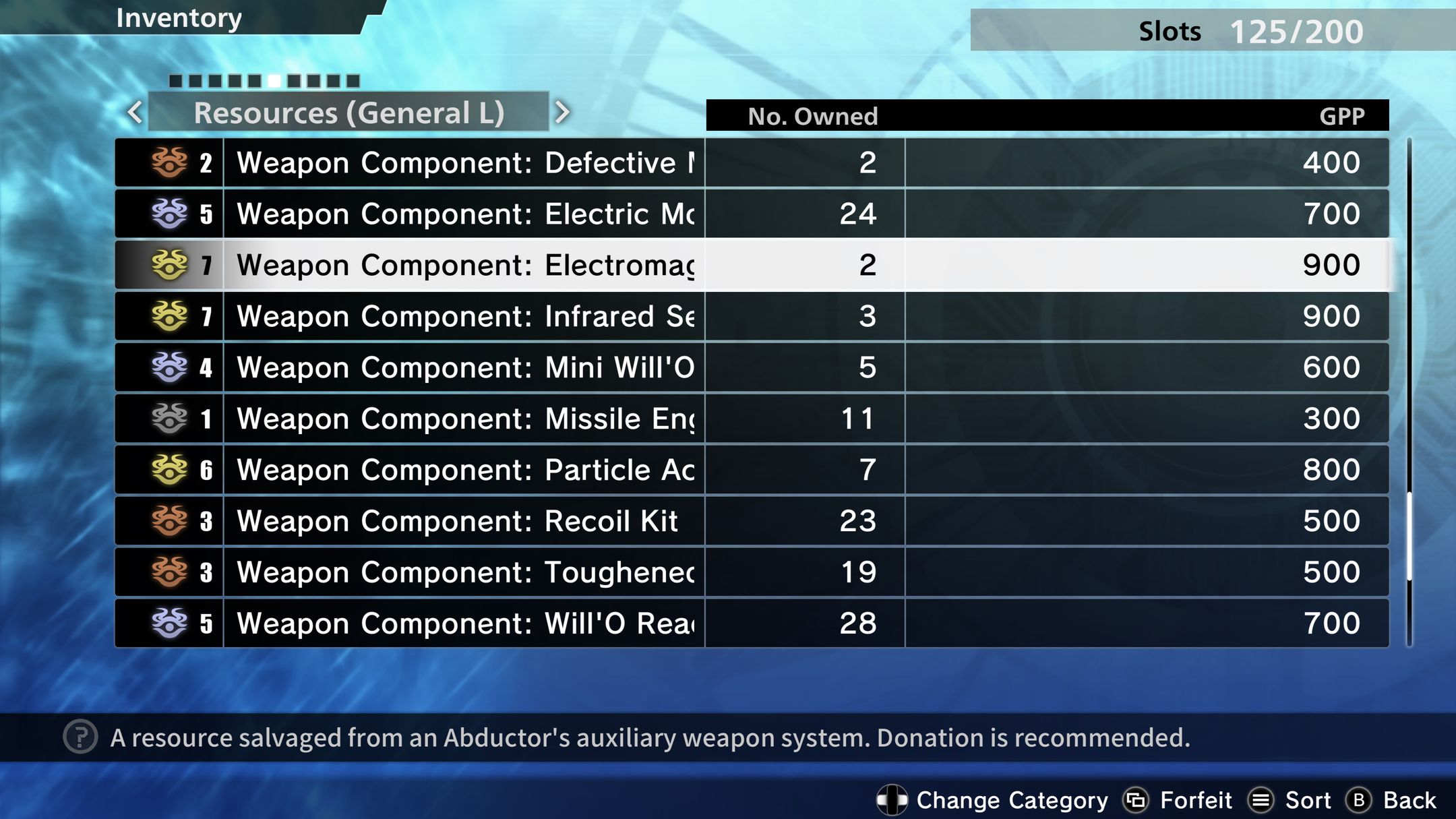 Puedes recopilar varios recursos a medida que completas las misiones. Sin embargo, los que están etiquetados como "Componente de arma" no se pueden usar para producir o mejorar armas directamente, por lo que es mejor donarlos y recibir puntos de derecho en su lugar.